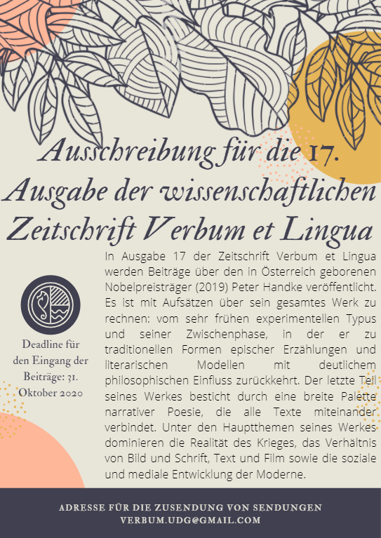 A revista Verbum: Didaktik, Linguistik und Kultur, organizada pelo Centro de Línguas Estrangeiras Modernas da Universidade de Guadalajara, abre uma chamada para trabalhos sobre o escritor austríaco Peter Handke.