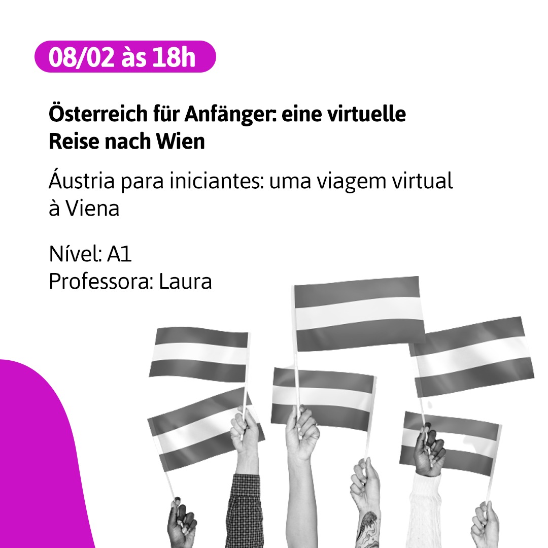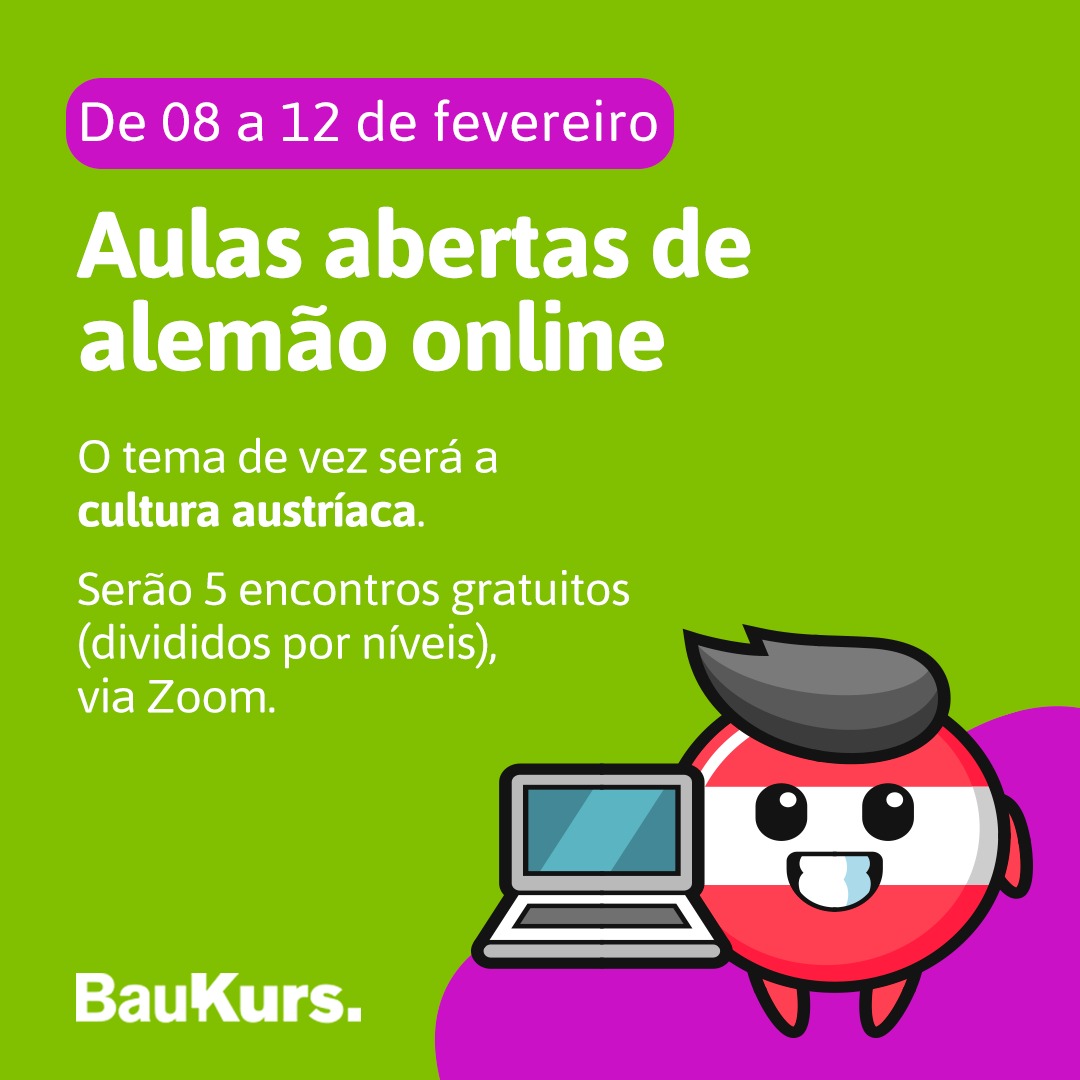 A escola de língua alemã Baukurs promove aulas abertas sobre cultura austríaca entre os dias 08 e 12 de fevereiro de 2021. Os cinco encontros são divididos por nível de conhecimento de língua alemã e abordam temas como a cidade de Viena, literatura e arte austríacas e ainda bolsas e oportunidades de estudo no país. Veja a programação completa e as informações de inscrição abaixo: