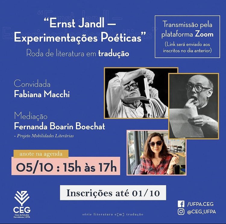 As experimentações poéticas do poeta austríaco Ernst Jandl serão apresentadas em nossa Roda pela convidada Fabiana Macchi. Tradutora, pesquisadora e docente na Universidade Federal do Rio de Janeiro, Fabiana nos acompanhará na leitura compartilhada de poemas de Jandl traduzidos por ela.