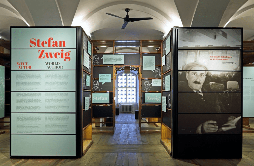 Além de uma mostra permanente sobre a literatura dos séculos XX e XXI – repleta de objetos com relevância literária, gravações de áudio, vídeos, trechos de obras famosas e apresentações de nomes esquecidos, mas relevantes para a literatura do país – o museu exibe também exposições temporárias. Neste momento, está em cartaz a mostra “Stefan Zweig – Weltautor” (“Stefan Zweig – escritor do mundo”). A exposição foca o papel de Zweig como autor de língua alemã mais lido e traduzido no mundo e sua relação com países e personalidades históricas universais. Zweig realizou muitas viagens, por exemplo, à Rússia, à Índia, aos Estados Unidos, a muitos países europeus etc. e, como sabemos, se exilou no Brasil. A exposição mostra, por exemplo, muitos cartões-postais escritos por Zweig durante suas viagens e fotos feitas pelo próprio autor em lugares famosos e exóticos ao redor do mundo. São testemunhos fascinantes de uma outra época, em que viajar ainda demandava mais tempo e um espírito mais aventureiro do que hoje.