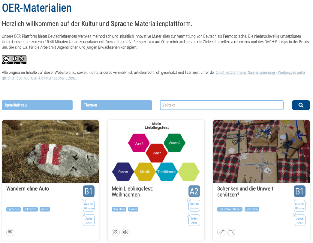 A seção Cultura e Língua (Referat Kultur und Sprache) da Agência Austríaca para Cooperação Internacional em Educação e Pesquisa (OeAD) está disponibilizando uma nova plataforma digital com materiais didáticos sobre diversos temas relacionados à Áustria. Trata-se de materiais inovadores que podem ser baixados e usados de forma gratuita por todo docente de alemão (“Open Educacional Resources”), podem ser adaptados livremente às necessidades de cada turma e ainda contam com dicas didáticas e informações culturais e linguísticas para os professores/as professoras que não estejam muito familiarizados/as com os temas abordados. O tempo previsto para o uso dos materiais disponibilizados em sala de aula varia entre 15 e 45 minutos e as atividades preveem o acesso a fontes atuais e autênticas. Assim, os alunos podem conhecer discursos em circulação nos países de língua alemã atualmente e se familiarizar com temas e informações importantes para entender e participar de conversas com falantes de alemão.