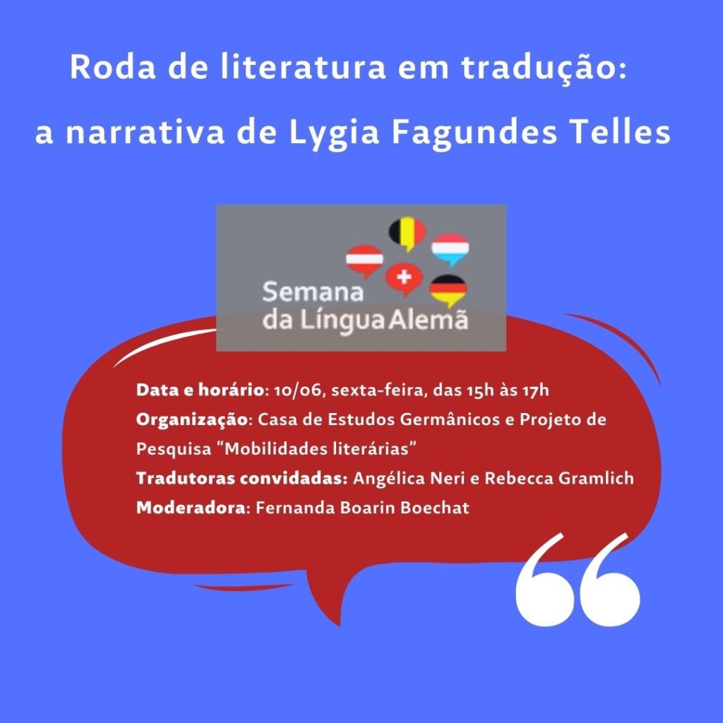 Além disso, convidamos para a Roda de Literatura em Tradução: a narrativa de Lygia Fagundes Telles, com a participante do Centro Austríaco Angélica Neri e Rebecca Gramlich, que traduziram o conto “Um chá bem forte e três xícaras” da autora brasileira para o alemão para publicação em uma Antologia de Contos Brasileiros organizada pela Universidade de Viena. O evento é organizado pela Casa de Estudos Germânicos da UFPA.