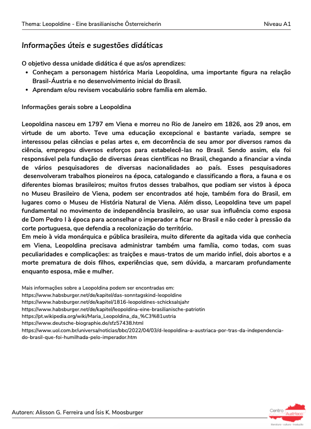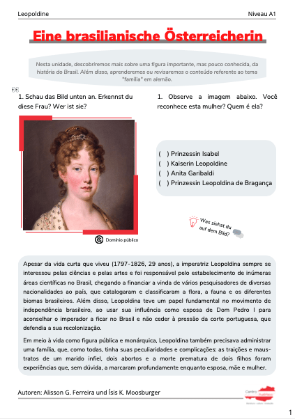 Você sabia que Dona Leopoldina, esposa de D. Pedro I, era austríaca? O novo material didático do Centro Austríaco foi desenvolvido para apresentar para estudantes iniciais (A1) de alemão esta figura importante, mas até então pouco mencionada, da história brasileira. Por meio do tema Família, mostramos um pouco mais da vida e da família daquela que foi uma das figuras centrais na independência do Brasil e também responsável por coordenar o surgimento das mais diversas áreas da ciência no Brasil.
