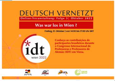A 3º edição da série Deutsch Vernetzt de 2022, intitulado “Was war los in Wien?”, será realizado online na sexta-feira, dia 21 de outubro, das 14 às 17 horas. O evento é uma oportunidade para conhecer mais de 20 trabalhos que professores e docentes de todo o Brasil apresentaram durante o Congresso Internacional de Professoras e Professores de Alemão (IDT) em Viena. Ruth Bohunovsky, coordenadora do Centro Austríaco, apresenta uma fala intitulada “Dach-Lehren und -Lernen in zielsprachenfernen Ländern auf Anfängerniveau” sobre o projeto acadêmico da Universidade Federal do Paraná que realiza a elaboração de materiais didáticos para o ensino a partir do princípio DACH, e Alessandra Freitas, participante do centro, fala sobre a tematização de Conchita Wurst na produção de material didático em sua apresentação intitulada “Conchita Wurst kommt zum DaFUnterricht”.