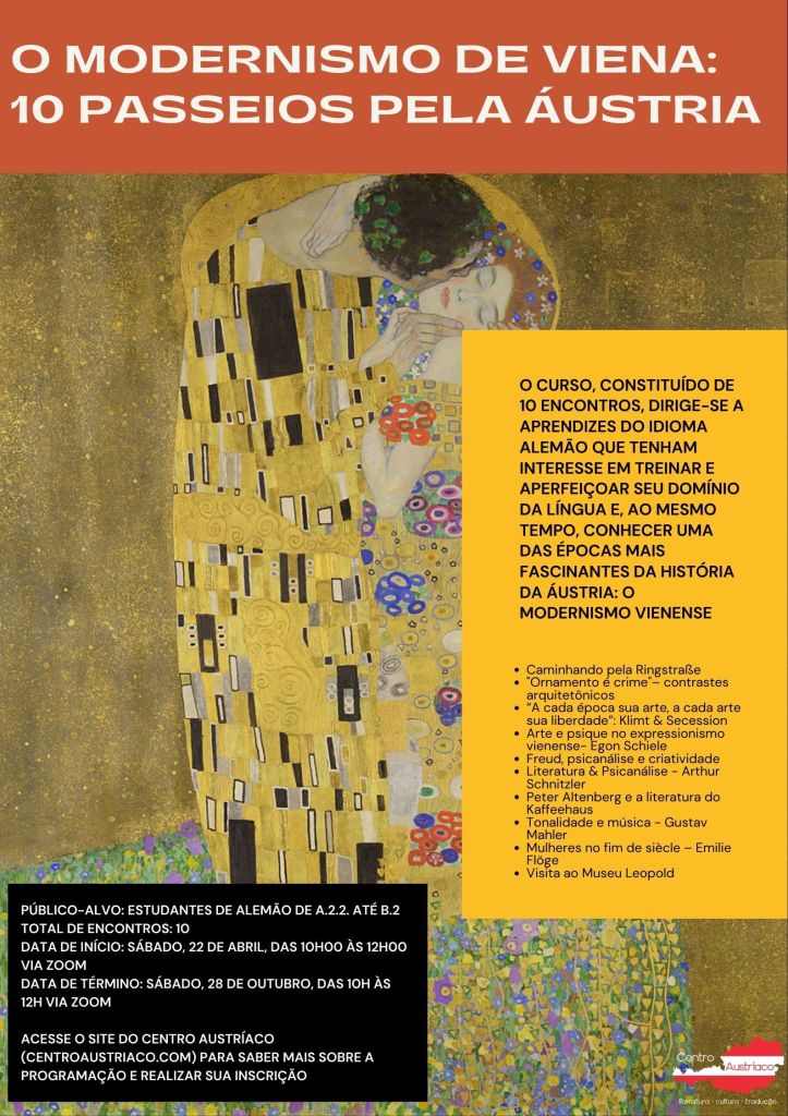 Este curso se dirige a aprendizes do idioma alemão (a partir do nível A.2.2) que tenham interesse em aprender sobre diferentes ramos artísticos de uma das épocas mais famosas e fascinantes da cultura europeia: o Modernismo Vienense. Com base na aprendizagem estética, o curso despertará a curiosidade através da observação e percepção consciente de formas, cores e tons e sua correlação com o mundo das palavras e conceitos em alemão. Visitaremos, entre outros, obras de Gustav Klimt e Egon Schiele, desenhos de Emilie Flöge, conheceremos a perspectiva psicológica sobre o processo criativo a partir das teorias de Sigmund Freud e sua relação com a literatura de Arthur Schnitzler. Além disso, faremos passeios virtuais pela cidade de Viena, para conhecer os mais importantes monumentos arquitetônicos construídos na época do Modernismo Vienense e, assim, desenvolver não apenas uma intuição para o misterioso e o belo, mas também para a filosofia e o pensamento, e as palavras que se escondem atrás de cada expressão artística.
