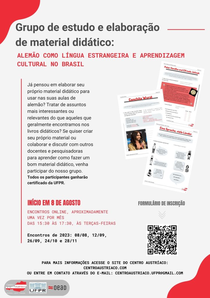 O grupo pretende promover a discussão sobre tendências atuais no campo da elaboração de materiais didáticos para o ensino de alemão como língua estrangeira e a elaboração de novos materiais. Tem interesse especial por analisar ou produzir materiais que procuram instigar a aprendizagem cultural-reflexiva e em assuntos relacionados ao universo cultural e discursivo da Áustria, mas também aos outros países de língua alemã. O grupo está aberto a pessoas da comunidade, com ou sem perfil acadêmico. Haverá aproximadamente 10 encontros por ano, de modo virtual, de duração de, no máximo, 120 minutos.