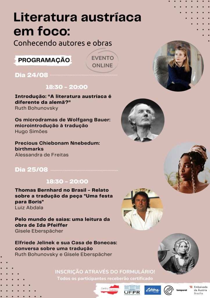 O evento, organizado pelo Centro Austríaco com o apoio da Editora UFPR, da Editora Temporal, da Embaixada da Áustria e da Universidade Federal do Paraná, tem o intuito de apresentar algumas discussões acerca da literatura de língua alemã, assim como introduzir ao público alguns autores e obras austríacas.