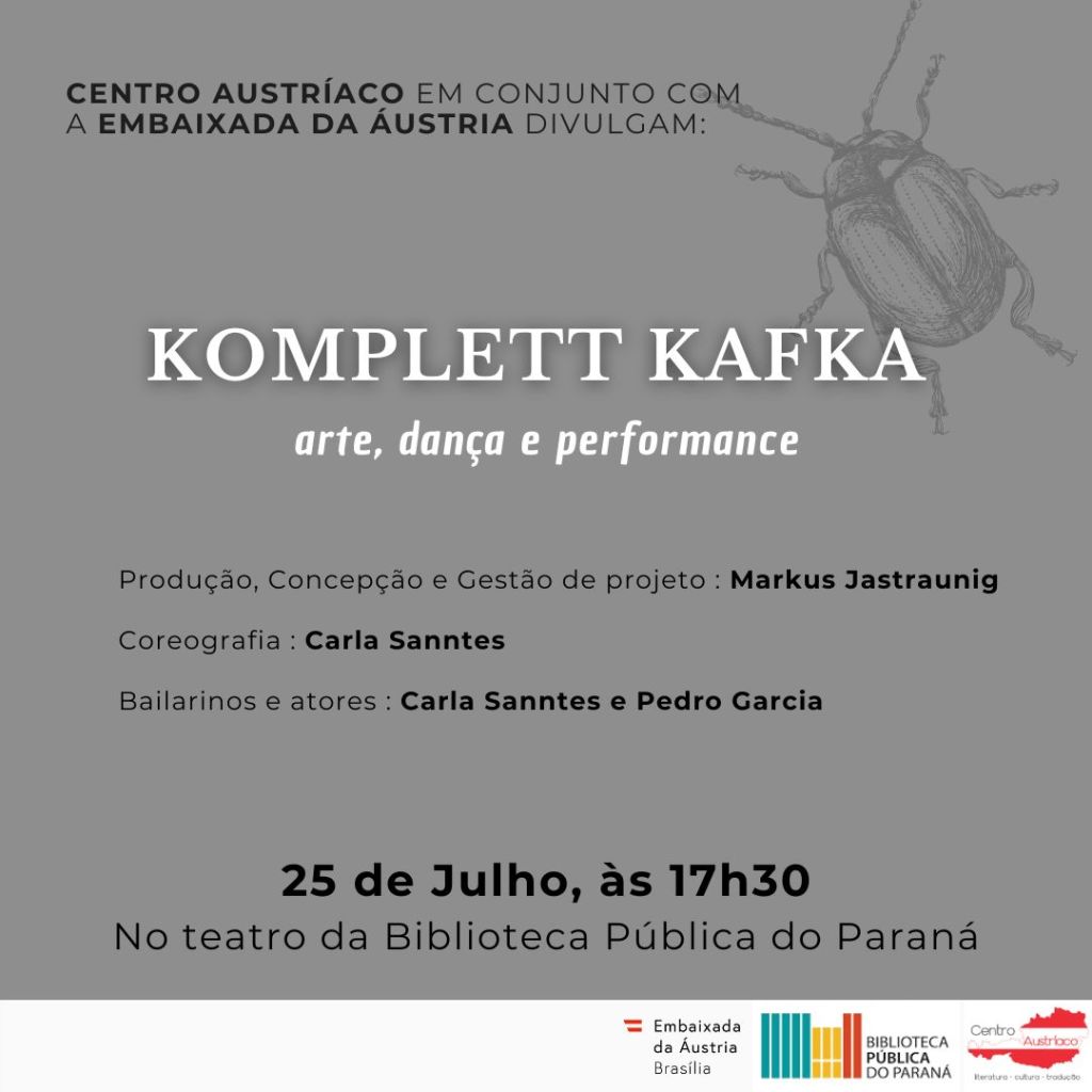 “A lógica pode ser inabalável, mas não resiste a quem quer viver.” O escritor Franz Kafka, conhecido pelo seu estilo de escrita surrealista-irônico, tem o centenário de sua morte em 2024. Muitas das suas obras literárias mundialmente famosas, escritas em alemão, foram traduzidas para o português. Além da exposição “Franz Kafka: vida, obra e metamorfoses”, apresentamos uma performance única de teatro dança kafkiana. Nesta coprodução austro-brasileira, o ambiente social e familiar de Kafka é revivido e, em um diálogo dançante, o besouro de Kafka (“A Metamorfose”) e seu macaco (“Um Relatório para uma Academia”) discutem as armadilhas agridoces de ser humano.