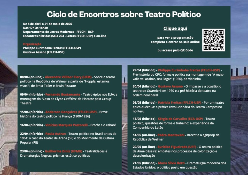 Um ciclo de encontros organizado por Philippe Curimbaba Freitas e por Gustavo Assano traz debates sobre o teatro político. O evento acontece de forma híbrida (com encontros presenciais na USP, em São Paulo) ou online entre os dias 08 de abril e 21 de março de 2026.