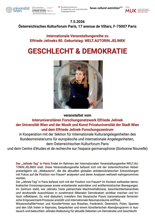 Dentro da série de eventos que marca os 80 anos da escritora austríaca Elfriede Jelinek, o centro de pesquisas “Interuniversitäre Forschungsnetzwerk Elfriede Jelinek”, da Universidade de Viena e da MUK, convida para o evento “Geschlecht & Demokratie”, que acontece em Paris (no Fórum Cultural Austríaco de Paris, em cooperação com o grupo de pesquisa CEREG) no dia 7 de maio de 2026.