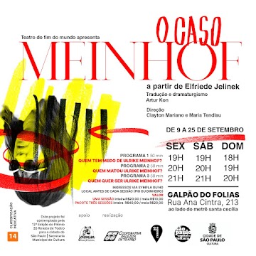 O Teatro do Fim do Mundo traz para os palcos de São Paulo uma montagem da peça Ulrike Maria Stuart, de autoria da vencedora do prêmio Nobel de Literatura austríaca Elfriede Jelinek. Com o título O Caso Meinhof, o texto foi dividido em três programas de 50 minutos, que podem ser vistos em conjunto ou de forma independente. A peça estará em cartaz entre os dias 9 e 25 de setembro de 2022, de sexta-feira a domingo. Veja mais informações aqui.